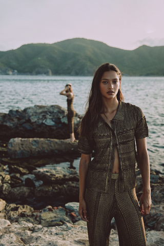 Gold-colored fabric set consisting of a button-down blouse and long trousers. The blouse, with a loose silhouette and classic collar, offers a balance between structure and lightness, while the straight-leg trousers flow naturally with the body's movements. The subtle shimmer of gold provides a distinctive character, making this ensemble a statement of serene yet powerful style.